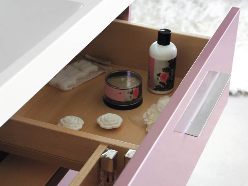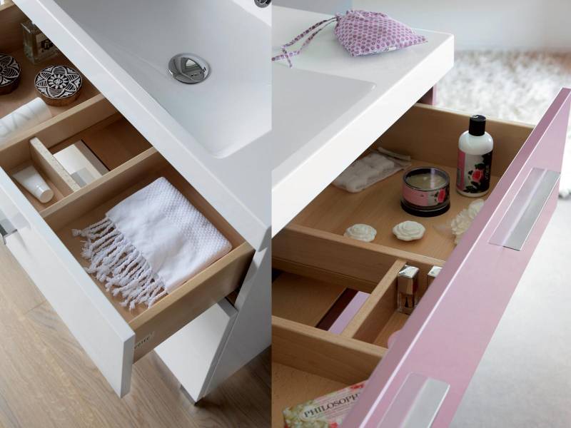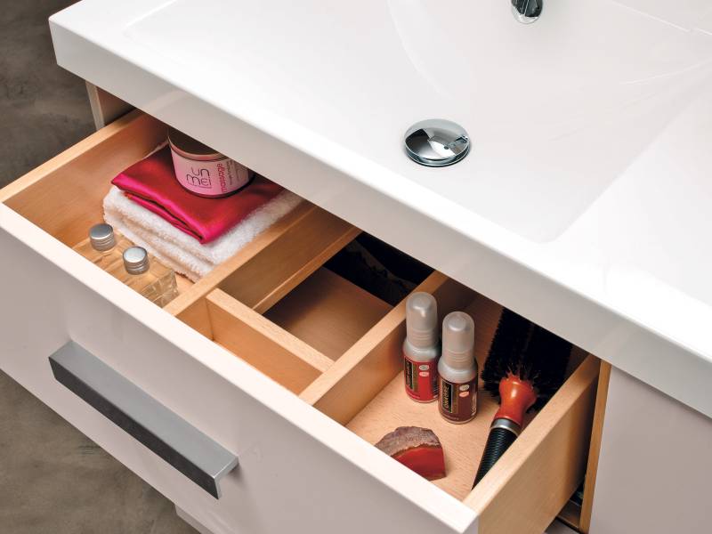 Les tiroirs sont aménagés avec des compartiments de rangement, en finition hêtre naturel. Une prise électrique est prévue à l'intérieur du meuble vasque, côté droit.