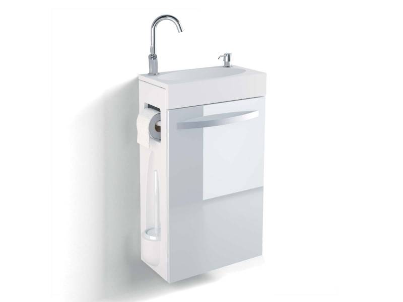 44 cm et de profondeur 26,4 cm, il est livré avec un distributeur de savon intégré ainsi qu'une tablette intérieur.