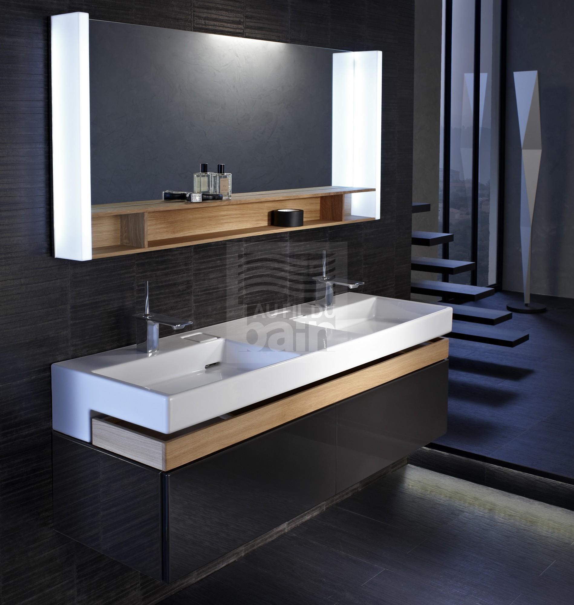 Le double plan vasque de Jacob Delafon propose un bandeau led avec un système d'évacuation FreeDrain (bonde cachée).